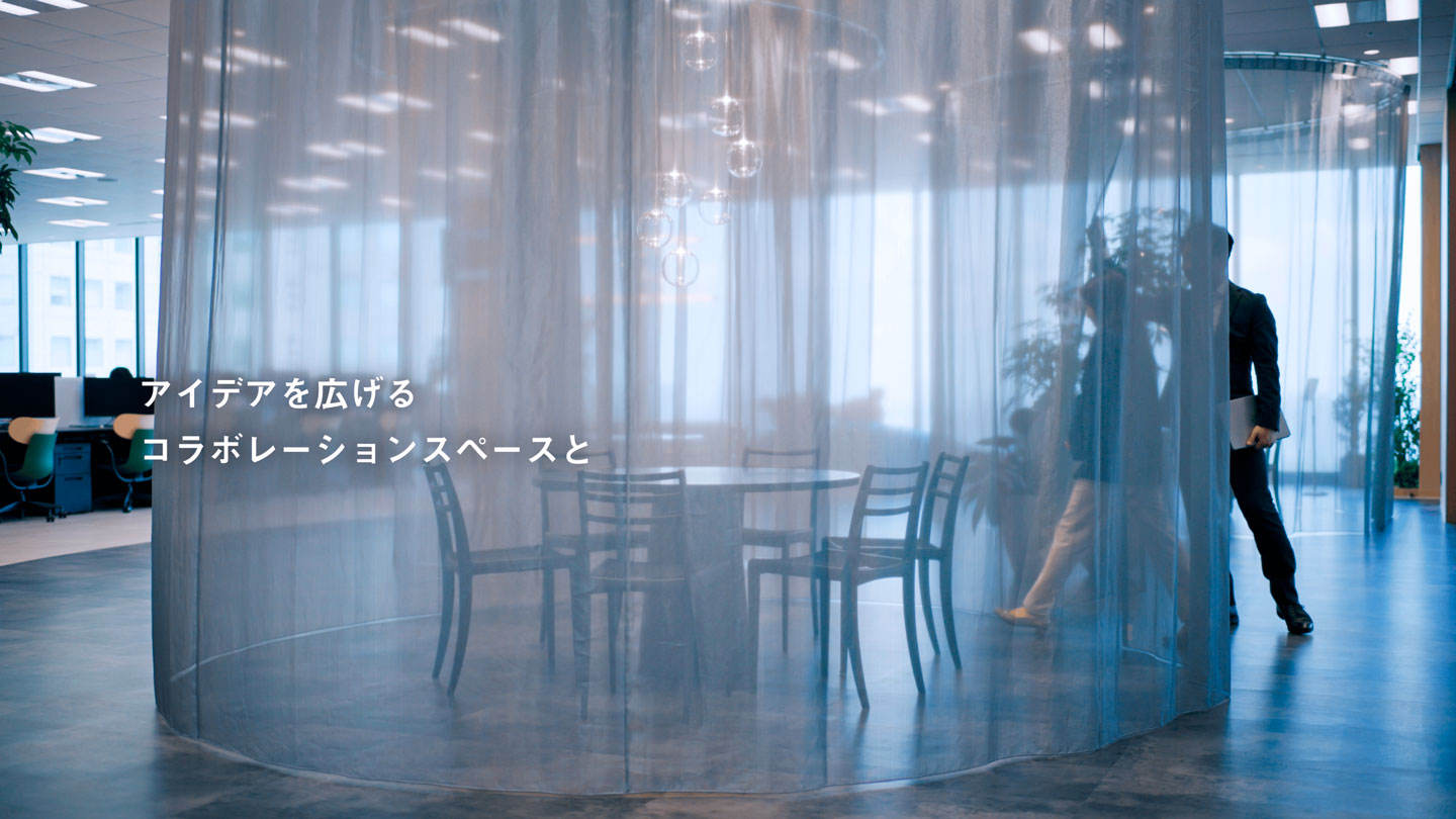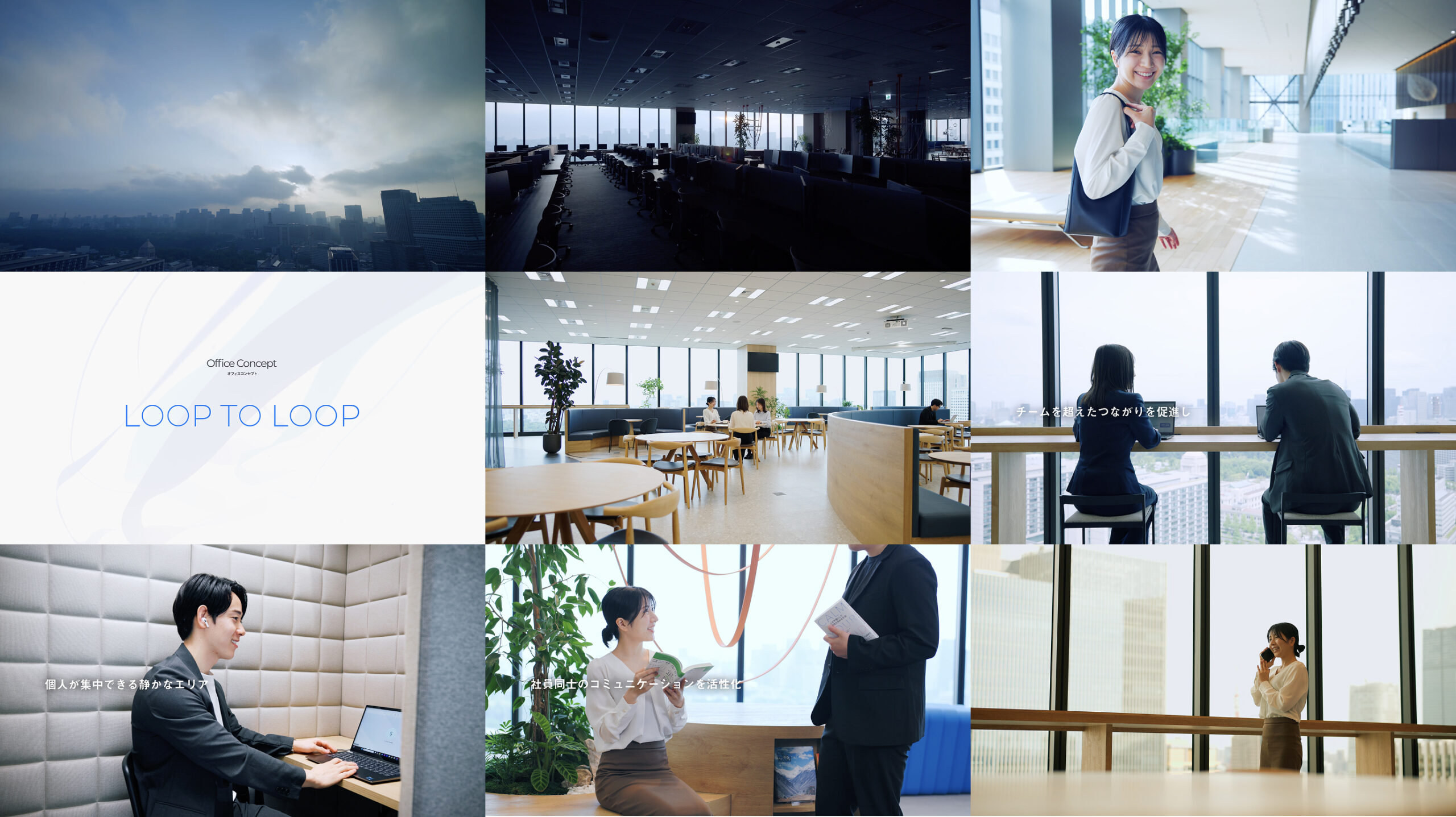 単なる施設紹介の枠を超えて実際に働く環境をより身近に感じられるよう、「オフィスで過ごす1日」というストーリーを軸に映像を構成。駅直結という立地の良さや広大な空間がもたらす利便性を提示しつつ、オフィスコンセプトである「LOOP TO LOOP」に基づいた、細部までこだわり抜かれた意匠性の高さも深く訴求しています。