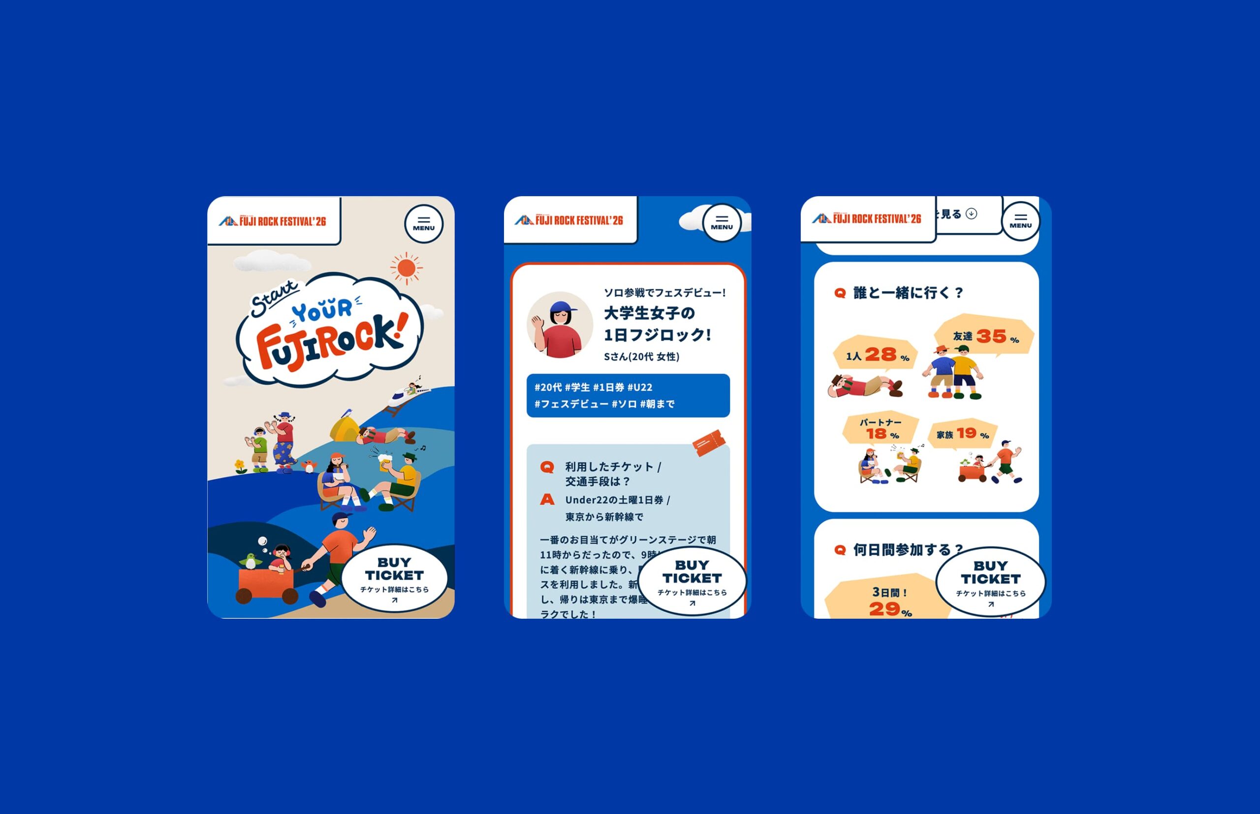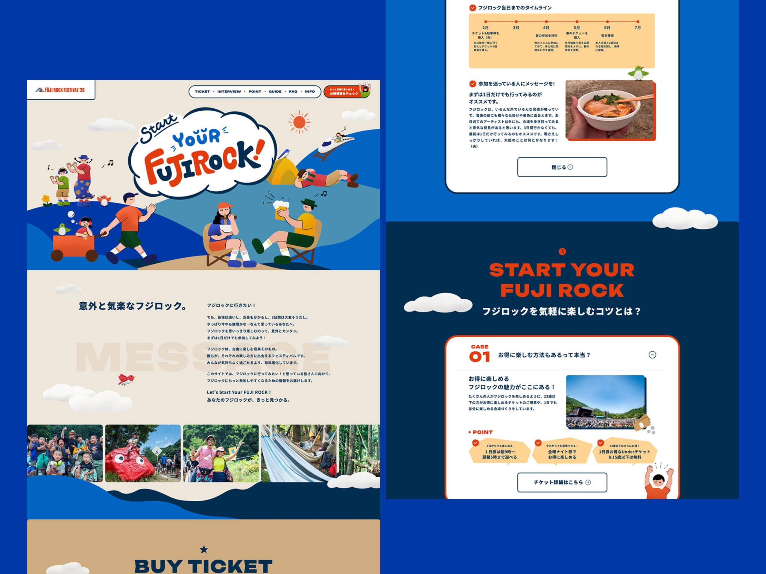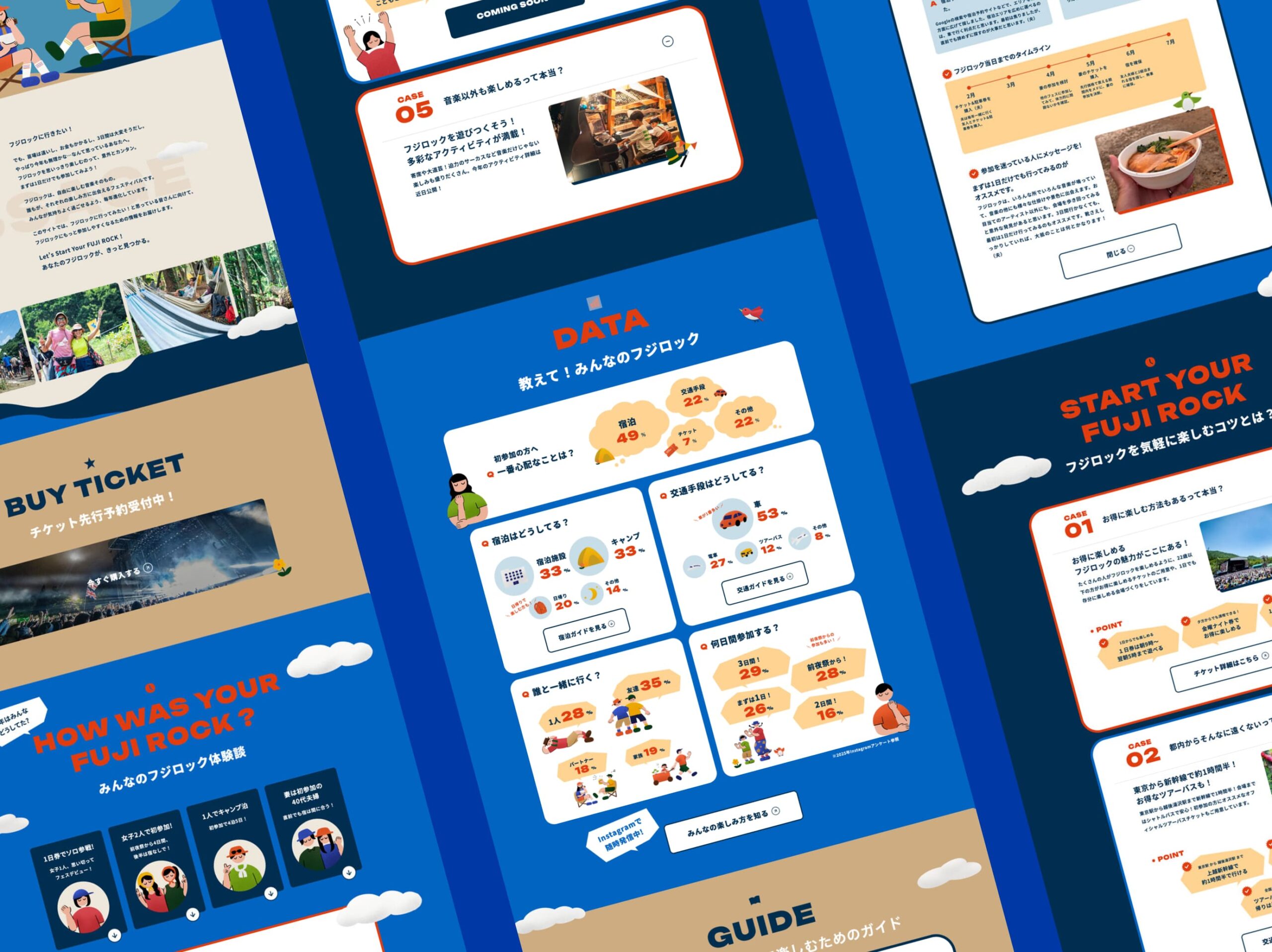 「意外と気楽なフジロック。」というコピーのもと、「興味はあるけど、ちょっと不安」という心理的ハードルに寄り添い、アクセスや持ち物、会場の楽しみ方をわかりやすくガイドするコンテンツを設計。人それぞれの楽しみ方に出会えるフジロックの楽しさを、ゆるやかなイラストの世界観で表現しました。